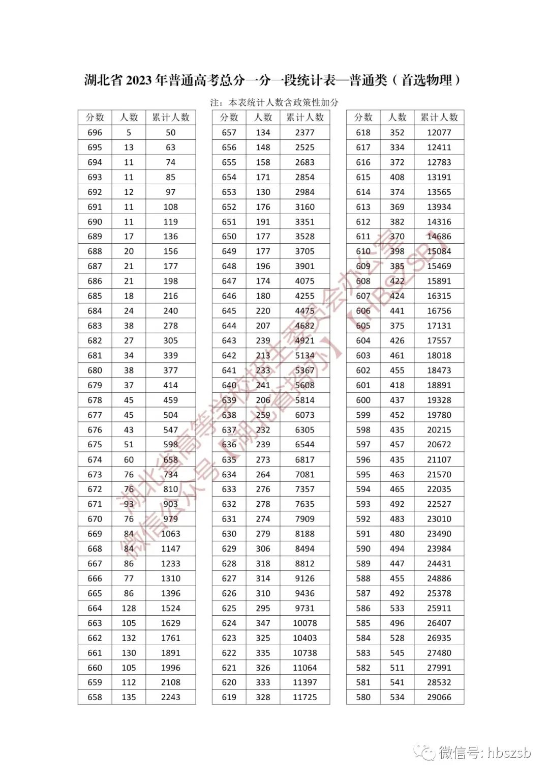 湖北省2023年普通高考总分一分一段统计表 首选物理